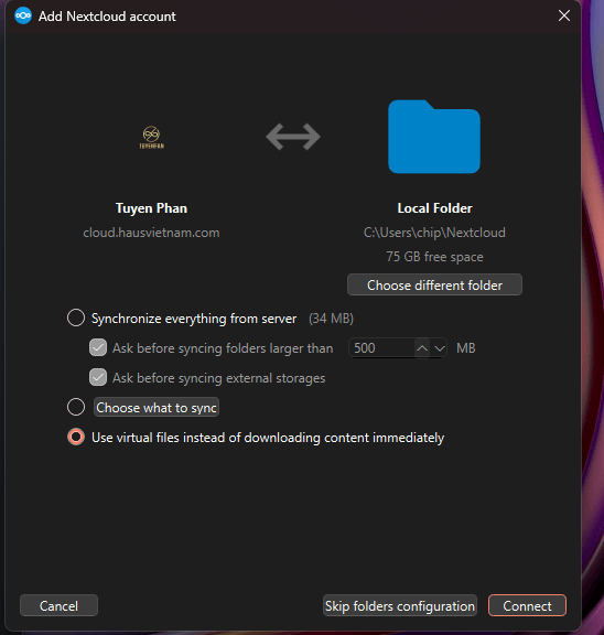 Lưu ý chọn Use virtual files insteasd of dowloading content immediately.
