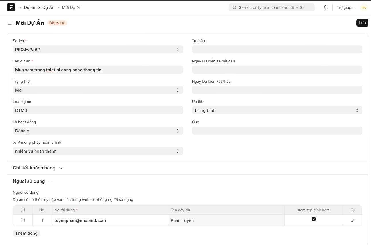 Tại mục người sử dụng  cập nhật thông tin Người sẽ tham gia vào dự án.